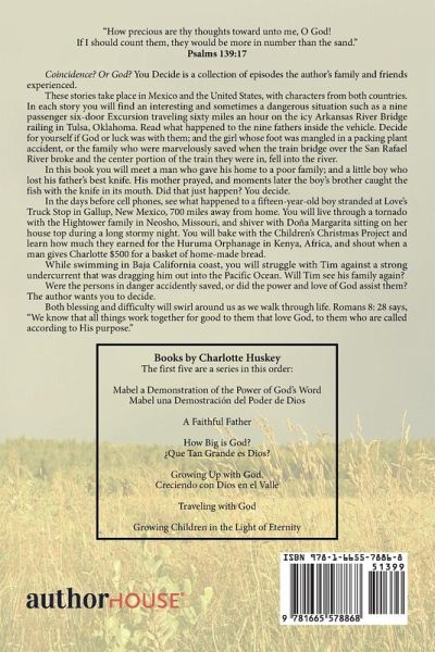 Coincidence? Or God? You Decide is a collection of episodes the author's family and friends experienced. These stories take place in Mexico as well as the United States. In each story, you will find a fascinating and sometimes life-threatening situation, such as a nine-passenger, six-door Excursion traveling sixty miles an hour on the icy Arkansas River Bridge railing in Tulsa, Oklahoma. Read what happened to the nine fathers in this vehicle. Decide for yourself if God or luck was with them. Then, there is the girl whose foot was mangled in a packing plant accident, or the family who was marvelously saved when the train bridge over the San Rafael River collapsed and the center portion of the train they had been in, fell into the river. In this book you will meet a man who gave his home to a poor family; and a little boy who lost his father's best knife in a lake. His mother prayed, and moments later the boy's brother caught a fish with the knife in its mouth. Did that just happen? You decide. In the days before cell phones, see what happened to a fifteen-year-old boy stranded at Love's Truck Stop in Gallup, New Mexico, 700 miles from home. You will live through a tornado with the Hightower family in Neosho, Missouri, and shiver with Dofia Margarita sitting on her house top during a long night. You will bake with the Children's Christmas Project and learn how much they earned for the Huruma Orphanage in Kenya, Africa, and shout when a man gives Charlotte $500 for a basket of homemade bread. While swimming on the Baja California coast, you will struggle with Tim against a strong undercurrent that was dragging him out into the Pacific Ocean. Will Tim see his family again? Were the persons in danger accidentally saved, or did the power and love of God assist them? The author wants you to decide. Both blessings and difficulties will swirl around us as we walk through life. Romans 8:28 says, "We know that all things work together for good to them that love God, to them who are called according to His purpose." Psalms 139:17 How precious are thy thoughts toward unto me, O God! If I should count them, they would be more in number than the sand."
