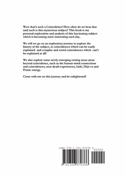 Wow that's such a Coincidence! How often do we hear that said such is this mysterious subject? This book is my personal exploration and analysis of this fascinating subject which is becoming more interesting each day. We will we go on an exploratory journey to explore the history of the subject, to coincidences which can be easily explained and complex and weird coincidences which can't be explained at all! We also explore some newly emerging exiting areas areas beyond coincidence, such as the human mind connections and coincidences, near death experiences, faith, Déjà vu and Pranic energy. Come with me on this journey and be enlightened!