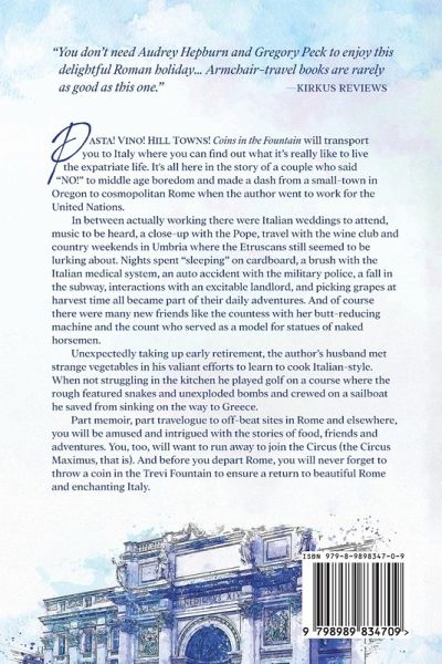 Pasta! Vino! Hill Towns! Coins in the Fountain will transport you to Italy where you can find out what it's really like to live the expatriate life. It's all here in the story of a couple who said "NO!" to middle age boredom and made a dash from a small-town in Oregon to cosmopolitan Rome when the author went to work for the United Nations. In between actually working there were Italian weddings to attend, music to be heard, a close-up with the Pope, travel with the wine club and country weekends in Umbria where the Etruscans still seemed to be lurking about. Nights spent "sleeping" on cardboard, a brush with the Italian medical system, an auto accident with the military police, a fall in the subway, interactions with an excitable landlord, and picking grapes at harvest time all became part of their daily adventures. And of course there were many new friends like the countess with her butt-reducing machine and the count who served as a model for statues of naked horsemen. Unexpectedly taking up early retirement, the author's husband met strange vegetables in his valiant efforts to learn to cook Italian-style. When not struggling in the kitchen he played golf on a course where the rough featured snakes and unexploded bombs and crewed on a sailboat he saved from sinking on the way to Greece. Part memoir, part travelogue to off-beat sites in Rome and elsewhere, you will be amused and intrigued with the stories of food, friends and adventures. You, too, will want to run away to join the Circus (the Circus Maximus, that is). And before you depart Rome, you will never forget to throw a coin in the Trevi Fountain to ensure a return to beautiful Rome and enchanting Italy.