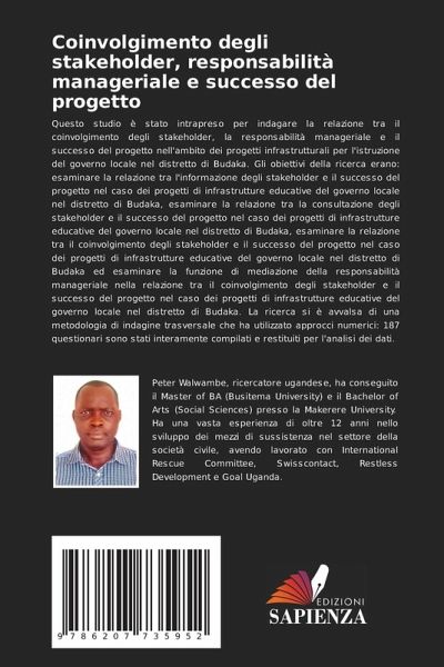 Questo studio è stato intrapreso per indagare la relazione tra il coinvolgimento degli stakeholder, la responsabilità manageriale e il successo del progetto nell'ambito dei progetti infrastrutturali per l'istruzione del governo locale nel distretto di Budaka. Gli obiettivi della ricerca erano: esaminare la relazione tra l'informazione degli stakeholder e il successo del progetto nel caso dei progetti di infrastrutture educative del governo locale nel distretto di Budaka, esaminare la relazione tra la consultazione degli stakeholder e il successo del progetto nel caso dei progetti di infrastrutture educative del governo locale nel distretto di Budaka, esaminare la relazione tra il coinvolgimento degli stakeholder e il successo del progetto nel caso dei progetti di infrastrutture educative del governo locale nel distretto di Budaka ed esaminare la funzione di mediazione della responsabilità manageriale nella relazione tra il coinvolgimento degli stakeholder e il successo del progetto nel caso dei progetti di infrastrutture educative del governo locale nel distretto di Budaka. La ricerca si è avvalsa di una metodologia di indagine trasversale che ha utilizzato approcci numerici: 187 questionari sono stati interamente compilati e restituiti per l'analisi dei dati.