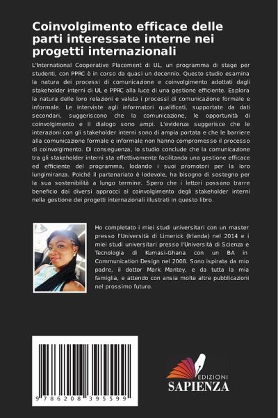 L'International Cooperative Placement di UL, un programma di stage per studenti, con PPRC è in corso da quasi un decennio. Questo studio esamina la natura dei processi di comunicazione e coinvolgimento adottati dagli stakeholder interni di UL e PPRC alla luce di una gestione efficiente. Esplora la natura delle loro relazioni e valuta i processi di comunicazione formale e informale. Le interviste agli informatori qualificati, supportate da dati secondari, suggeriscono che la comunicazione, le opportunità di coinvolgimento e il dialogo sono ampi. L'evidenza suggerisce che le interazioni con gli stakeholder interni sono di ampia portata e che le barriere alla comunicazione formale e informale non hanno compromesso il processo di coinvolgimento. Di conseguenza, lo studio conclude che la comunicazione tra gli stakeholder interni sta effettivamente facilitando una gestione efficace ed efficiente del programma, lodando i suoi promotori per la loro lungimiranza. Poiché il partenariato è lodevole, ha bisogno di sostegno per la sua sostenibilità a lungo termine. Spero che i lettori possano trarre beneficio dai diversi approcci al coinvolgimento degli stakeholder interni nella gestione dei progetti internazionali illustrati in questo libro.