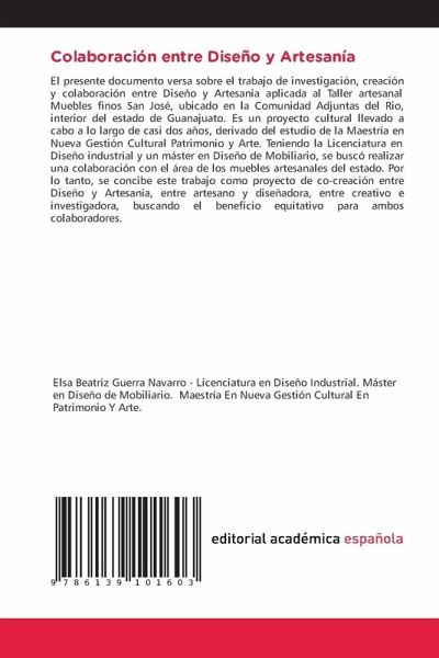 El presente documento versa sobre el trabajo de investigación, creación y colaboración entre Diseño y Artesanía aplicada al Taller artesanal Muebles finos San José, ubicado en la Comunidad Adjuntas del Rio, interior del estado de Guanajuato. Es un proyecto cultural llevado a cabo a lo largo de casi dos años, derivado del estudio de la Maestría en Nueva Gestión Cultural Patrimonio y Arte. Teniendo la Licenciatura en Diseño industrial y un máster en Diseño de Mobiliario, se buscó realizar una colaboración con el área de los muebles artesanales del estado. Por lo tanto, se concibe este trabajo como proyecto de co-creación entre Diseño y Artesanía, entre artesano y diseñadora, entre creativo e investigadora, buscando el beneficio equitativo para ambos colaboradores.