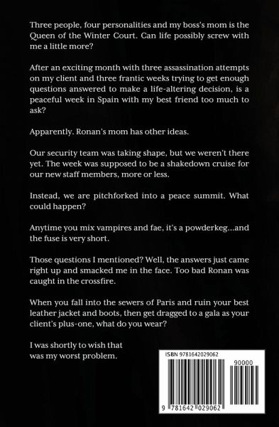 Three people, four personalities and my boss's mom is the Queen of the Winter Court. Can life possibly screw with me a little more? After an exciting month with three assassination attempts on my client and three frantic weeks trying to get enough questions answered to make a life-altering decision, is a peaceful week in Spain with my best friend too much to ask? Apparently. Ronan's mom has other ideas. Our security team was taking shape, but we weren't there yet. The week was supposed to be a shakedown cruise for our new staff members, more or less. Instead, we are pitchforked into a peace summit. What could happen? Anytime you mix vampires and fae, it's a powderkeg...and the fuse is very short. Those questions I mentioned? Well, the answers just came right up and smacked me in the face. Too bad Ronan was caught in the crossfire. When you fall into the sewers of Paris and ruin your best leather jacket and boots, then get dragged to a gala as your client's plus-one, what do you wear? I was shortly to wish that was my worst problem. Go Up and click Read For Free or Buy Now and find out if mothers really know best.