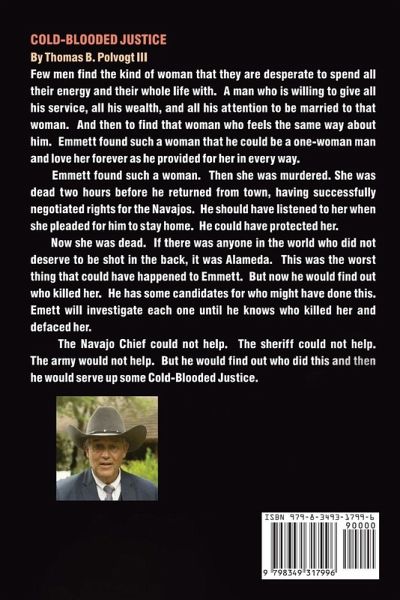COLD-BLOODED JUSTICE by Thomas B. Polvogt III Few men find the kind of woman that they are desperate to spend all their energy and their whole life with. A man who is willing to give all his service, all his wealth, and all his attention to be married to that woman. And then to find that woman who feels the same way about him. Emmett found such a woman that he could be a one-woman man and love her forever as he provided for her in every way. Emmett found such a woman. Then she was murdered. She was dead two hours before he returned from town, having successfully negotiated rights for the Navajos. He should have listened to her when she pleaded for him to stay home. He could have protected her. Now she was dead. If there was anyone in the world who did not deserve to be shot in the back, it was Alameda. This was the worst thing that could have happened to Emmett. But now he would find out who killed her. He has some candidates for who might have done this. Emmett will investigate each one until he knows who killed her and defaced her. The Navajo Chief could not help. The sheriff could not help. The army would not help. But he would find out who did this and then he would serve up some Cold-Blooded Justice.