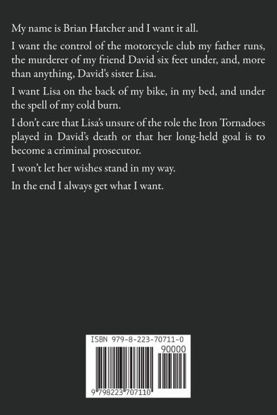 My name is Brian Hatcher and I want it all. I want the control of the motorcycle club my father runs, the murderer of my friend David six feet under, and, more than anything, David's sister Lisa. I want Lisa on the back of my bike, in my bed, and under the spell of my cold burn. I don't care that Lisa's unsure of the role the Iron Tornadoes played in David's death or that her long-held goal is to become a criminal prosecutor. I won't let her wishes stand in my way. In the end I always get what I want.