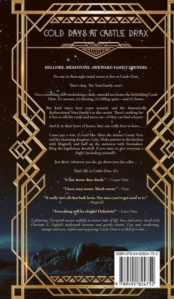 Hellfire. Brimstone. Awkward family dinners. No one in their right mind wants to live at Castle Drax. That's okay. The Vexx family aren't. On a crumbling cliff overlooking a dark, emerald sea looms the forbidding Castle Drax. It's ancient, it's freezing, it's falling apart-and it's home. But hard times have come around, and the demonically dysfunctional Vexx family's in dire straits. There's nothing for it but to sell the castle and move on-if they can find a buyer. And if, in their heart of hearts, they can really bear to leave... Come pay a visit, if you'd like. Meet the sinister Count Vexx and his charming daughter, Lulu. Make pastries in the kitchen with Magwell, and buff up the motorcar with Stormdust. Ring the lugubrious doorbell, if you want to give everyone a fright (including yourself). Just don't, whatever you do, go down into the cellar... That's life at Castle Drax. It's: "A fate worse than death." - Count Vexx "I have seen worse. Much worse." - Fane "It really isn't all that bad, lovie. Not once you've got used to it." - Magwell "Everything will be alright! Definitely!" - Luna Vexx A glittering, Decopunk mosaic unfolds in sixteen tales of life, love, and curses, laced with Charlotte E. English's trademark humour and quirky charm. Cosy and comforting, strange and wise, stylish and surprising; Castle Drax is a Hell of a time...