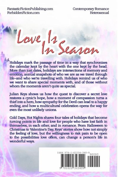 Holidays mark the passage of time in a way that synchronizes the calendar kept by the heart with the one kept by the head. Julian Keys shows us how the quest to discover a secret love restores a cynic's hope, how a moment of compassion turns a thief into a hero, how sympathy for the Devil can lead to a happy ending, and how a multicultural celebration opens the way for even the most unlikely unions. Cold Days, Hot Nights shares four tales of holidays that become turning points in life and love for people who have lost faith in themselves, in each other, and in romance. From Halloween to Christmas to Valentine's Day, Keys' stories show how not simply the feeling of love, but the willingness to risk pain to be open to the possibilities love offers, can change a person's life in wonderful ways.