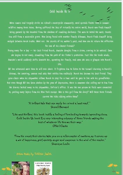 Book Reviews: Sherell Bernard "The drama surrounding the lives of three friends, Burch, MJ and Ami, continues to unfold in Cold Inside Us Book 2, revealing the amazing talent of Jamaican author Tabitha Smith. She has developed a moving plot that keeps the reader engaged along with characters whose emotions and thoughts connect with the reader. And at the backdrop of such an incredible story, are the powerfully penned themes of disenchantment, youthful desires, grief, tragedy, friendship and hope. A brilliant tale that can easily be coined a 'must read'." Oneil Clarke "Once again, I have to laud Tabitha on a next well written book. One decisive factor of a successful novel is that it brings about social reforms. This page turner addresses the issues of stigmatization, and another prevalent problem that is hushed by society because of its gruesome nature. Despite the serious issues that the book addresses; it is still very entertaining. Like most thrillers; this book instills a feeling of foreboding towards impending doom. Cold Inside Us book II, a very interesting odyssey of three friends making the best of whatever life throws their way. The fortitude of the narrator is really admirable, as it communicates good character traits to teenagers. It is a definite must read." Shenelle Bell "I must say "Cold Inside Us " books are both interesting and fun to read. As a Jamaican teen, I liked how the stories captured our 'now-a-days' society. I especially, liked how these friends helped out each other as much as possible without even knowing it. It brought to life hope and life lessons. It is amazing how the author "Miss Tabitha Smith " took many of the struggles we face as teenagers locally, and turned them into fun, relatable, page turning stories. Cold Inside Us Book II also, highlighted frightening, raw issues we deal with in our everyday lives. I loved feeling immerse in the book and could even empathized with the characters throughout the story. I must say, I am amazed with this series book " Cold Inside Us". Shanique Leslie "Cold Inside II, follows the lives of Burch, MJ and Ami, who, although are struggling individually with their personal lives, they still find time to bond and share mutual love and respect for each other. From the onset, their stories take you on a rollercoaster of emotions, as it serves up a mix of happiness, grief, anxiety, anger and suspense in the mind of the reader. there is a sense of family and a community.