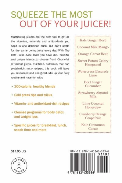 THE COMPLETE GUIDE TO JUICING, DIETING AND CLEANSING USING A SLOW-MASTICATING JUICER Masticating juicers are the best way to get all the vitamins, minerals and antioxidants you need in one delicious drink. But don't settle for the same boring juice every day. With The Cold Press Juice Bible you have 300 flavorful and unique blends to choose from! Chock-full of vibrant green, fruit-filled, nutritious root and protein-rich, nutty recipes, this book will leave you revitalized and energized. Mix up your daily routine and have fun with: - 200-calorie, healthy blends - Cold press tips and tricks - Vitamin- and antioxidant-rich recipes - Cleanse programs for body detox and weight loss - Specific juices for breakfast, lunch, snack time and more