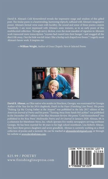 David R. Altman's Cold Remembered reveals the impressive range and wisdom of this gifted poet. The titular poem is a heartrending, harrowing triptych, suffused with Altman's imaginative power. Altman's formal verse soars with lucidity; the sound and sense of these poems conjoin beautifully. I am most impressed with Altman's sonic textures, as in an early poem of this multifaceted collection. Through nervy diction, even the most macabre of vignettes in Altman's work transcend mere transcription: "coyotes had roared into their hunger / and snagged all the deer's life away, / but the hide was left intact /like a burlap sack draped over bones." I eagerly await Altman's future work. It inspires me. -William Wright, Author of Grass Chapels: New & Selected Poems