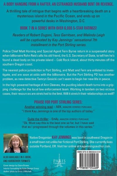 A body hanging from a rafter. An estranged husband bent on revenge. A thrilling tale of intrigue that begins with a heartbreaking death on a mysterious island in the Pacific Ocean, and ends up on powerful desks in Washington, D.C. Book 7 in a series with over 6,000 5-star ratings! Readers of Robert Dugoni, Tess Gerritsen, and Melinda Leigh will be captivated by Kay Jennings' sensational 7th installment in the Port Stirling series. Police Chief Matt Horning and Special Agent Fern Byrne return in a suspenseful story when billionaire Rohn Reid calls his old friend, the U.S. Secretary of State, to tell him he's found a dead body on his private island - Cold Rock Island, about thirty minutes off the southern Oregon coast. The nearest police jurisdiction is Port Stirling, and Matt and Fern are enlisted to investigate, and are soon at odds with the billionaire. But the Port Stirling PD has another problem, as new detective Tamryn Gesicki can't seem to begin her new life in peace. In the high-powered heritage of Ann Cleeves, the puzzling island death turns into a gripping challenge for the local law enforcement team. Working in tandem on two vicious cases, their resources are stretched to the limit. Will it stretch their relationships as well? Praise for Port Stirling series: Another winning read - AEK, Amazon verified purchase "I think Kay Jennings is one of the top authors of today." Quite the thriller - Emily, Amazon verified purchase "Ok. Must say this is the best one so far, but I have said that as I progressed through the volumes in this series."