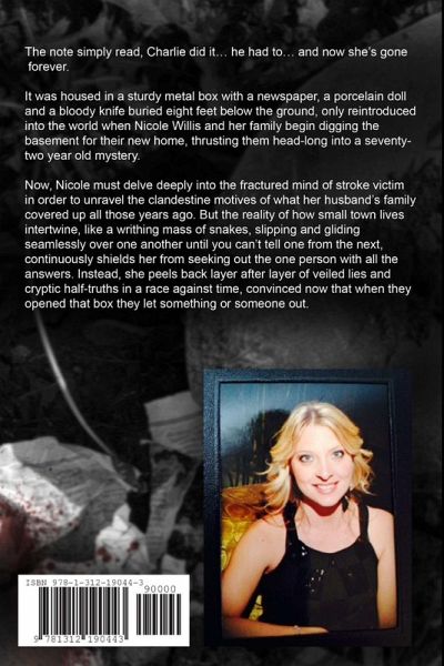 The note simply read, Charlie did it... he had to... and now she's gone forever. It was housed in a sturdy metal box with a newspaper, a porcelain doll and a bloody knife buried eight feet below the ground, only reintroduced into the world when Nicole Willis and her family begin digging the basement for their new home, thrusting them head-long into a seventy-two year old mystery. Now, Nicole must delve deeply into the fractured mind of stroke victim in order to unravel the clandestine motives of what her husband's family covered up all those years ago. But the reality of how small town lives intertwine, like a writhing mass of snakes, slipping and gliding seamlessly over one another until you can't tell one from the next, continuously shields her from seeking out the one person with all the answers. Instead, she peels back layer after layer of veiled lies and cryptic half-truths in a race against time, convinced now that when they opened that box they let something or someone out.