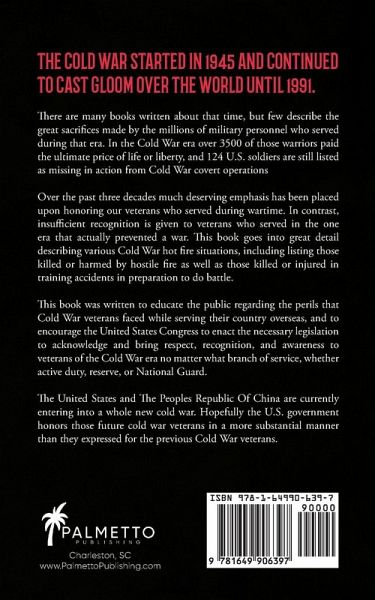 The Cold War started in 1945 and continued to cast gloom over the world until 1991. There are many books written about that time, but few describe the great sacrifices made by the millions of military personnel who served during that era. In the Cold War era over 3500 of those warriors paid the ultimate price of life or liberty, and 124 U.S. soldiers are still listed as missing in action from Cold War covert operations. Over the past three decades much deserving emphasis has been placed upon honoring our veterans who served during wartime. In contrast, insufficient recognition is given to veterans who served in the one era that actually prevented a war. This book goes into great detail describing various Cold War hot fire situations, including listing those killed or harmed by hostile fire as well as those killed or injured in training accidents in preparation to do battle. This book was written to educate the public regarding the perils that Cold War veterans faced while serving their country overseas, and to encourage the United States Congress to enact the necessary legislation to acknowledge and bring respect, recognition, and awareness to veterans of the Cold War era no matter what branch of service, whether active duty, reserve, or National Guard. The United States and The Peoples Republic Of China are currently entering into a whole new cold war. Hopefully the U.S. government honors those future cold war veterans in a more substantial manner than they expressed for the previous Cold War veterans.