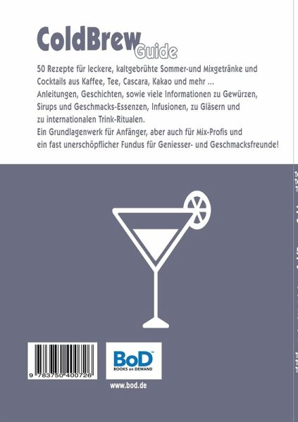 ColdBrew-Guide50 Rezepte für leckere, kaltgebrühte Sommer-Getränke aus Kaffee, Tee, Cascara, Kakao und mehr ...Anleitungen, Geschichten und Rezepte, sowie viele Informationen zu Gewürzen, Sirups und Geschmacks-Essenzen, Infusionen, zu Gläsern und zu internationalen Trink-Ritualen.Ein Grundlagenwerk für Anfänger, aber auch für Mix-Profis und ein fast unerschöpflicher Fundus für Geniesser- und Geschmacksfreunde!