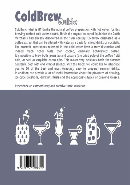ColdBrew, what is it? Unlike the normal coffee preparation with hot water, for this brewing method cold water is used. This is the cognac-coloured liquid that the Dutch merchants had already discovered in the 17th century. ColdBrew originated as a coffee extract that can be diluted with water as a basis for mixed drinks or cocktails. The aromatic substances released in the cold water have a truly distinctive and indeed much richer taste than cooled, originally hot-brewed coffee.It is possible to brew both green tea and cascara (the dried pulp of the coffee fruit) cold, as well as exquisite cacao nibs. This makes very delicious basis for summer cocktails, both with and without alcohol. With this book, we would like to introduce you to 50 of the best and most tempting, easy to prepare, summer drinks.In addition, we provide a lot of useful information about the pleasures of drinking, ice-cube creations, drinking rituals and the appropriate types of drinking glasses. Experience an extraordinary and creative taste sensation!