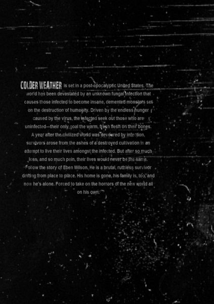 Colder Weather is an original novel series, set in a vast, horrifying world ravaged by an unknown, fungus-borne infection. Survivors can do nothing except fight for survival... but the infected aren't the only threat. Follow Eben Wilson, a survivor of the initial outbreak, he has seen all that this new, grim world has to offer, guided onward by nothing but the distant projection of his former self. But his humanity is impossible to retain in a place where those alive are both survivors and killers. Where it's impossible to choose one without choosing the other.