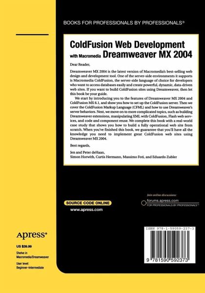 * Competitively priced, comprehensively illustrated, with in-depth "real world" applied content. There are only 2 other books that approach this subject matter, and our book is more concise, practical, and reaches a more advanced level that than the others. All source code for examples and case study will be openly available for download from www.apress.com. * In-depth final case study ¿ in the final chapter we explore the planning, design, and implementation of an entire fully working website, using all of the code, concepts, and techniques learnt in earlier chapters. This highly applied look at integrating ColdFusion and Dreamweaver in a complete project unifies all of the concepts learnt and takes our book above and beyond the competitors, which rely heavily on theory and small isolated examples. * The authors (in Particular Jen deHaan, Massimo Foti and Simon Horwith) are highly experienced and renowned members of the Dreamweaver and ColdFusion web communities.