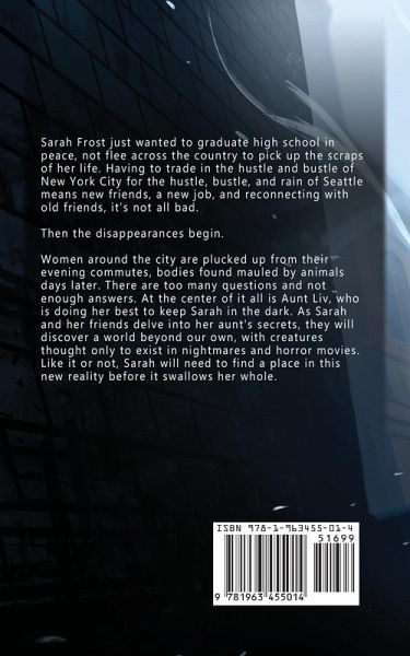 Sarah Frost just wanted to graduate high school in peace, not flee across the country to pick up the scraps of her life. Having to trade in the hustle and bustle of New York City for the hustle, bustle, and rain of Seattle means new friends, a new job, and reconnecting with old friends, it's not all bad. Then the disappearances begin. Women around the city are plucked up from their evening commutes, bodies found mauled by animals days later. There are too many questions and not enough answers. At the center of it all is Aunt Liv, who is doing her best to keep Sarah in the dark. As Sarah and her friends delve into her aunt's secrets, they will discover a world beyond our own, with creatures thought only to exist in nightmares and horror movies. Like it or not, Sarah will need to find a place in this new reality before it swallows her whole.