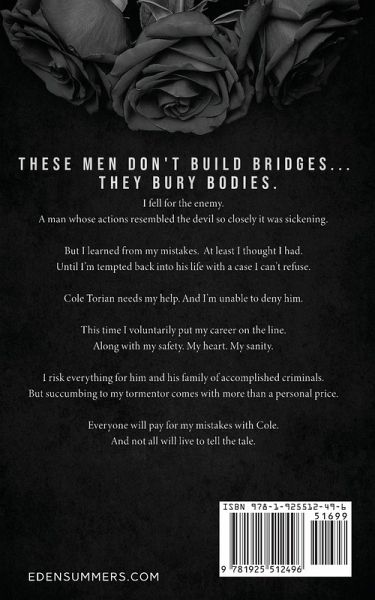 These men don't build bridges... They bury bodies. I fell for the enemy. A man whose actions resembled the devil so closely it was sickening. But I learned from my mistakes. At least I thought I had. Until I'm tempted back into his life with a case I can't refuse. Cole Torian needs my help. And I'm unable to deny him. This time I voluntarily put my career on the line. Along with my safety. My heart. My sanity. I risk everything for him and his family of accomplished criminals. But succumbing to my tormentor comes with more than a personal price. Everyone will pay for my mistakes with Cole. And not all will live to tell the tale.