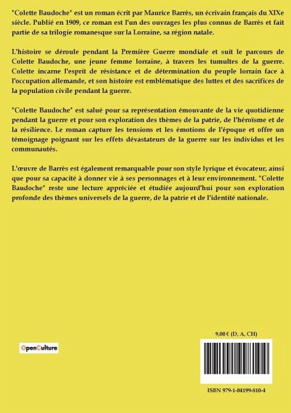 "Colette Baudoche" est un roman écrit par Maurice Barrès, un écrivain français du XIXe siècle. Publié en 1909, ce roman est l'un des ouvrages les plus connus de Barrès et fait partie de sa trilogie romanesque sur la Lorraine, sa région natale. L'histoire se déroule pendant la Première Guerre mondiale et suit le parcours de Colette Baudoche, une jeune femme lorraine, à travers les tumultes de la guerre. Colette incarne l'esprit de résistance et de détermination du peuple lorrain face à l'occupation allemande, et son histoire est emblématique des luttes et des sacrifices de la population civile pendant la guerre. "Colette Baudoche" est salué pour sa représentation émouvante de la vie quotidienne pendant la guerre et pour son exploration des thèmes de la patrie, de l'héroïsme et de la résilience. Le roman capture les tensions et les émotions de l'époque et offre un témoignage poignant sur les effets dévastateurs de la guerre sur les individus et les communautés. L'¿uvre de Barrès est également remarquable pour son style lyrique et évocateur, ainsi que pour sa capacité à donner vie à ses personnages et à leur environnement. "Colette Baudoche" reste une lecture appréciée et étudiée aujourd'hui pour son exploration profonde des thèmes universels de la guerre, de la patrie et de l'identité nationale.