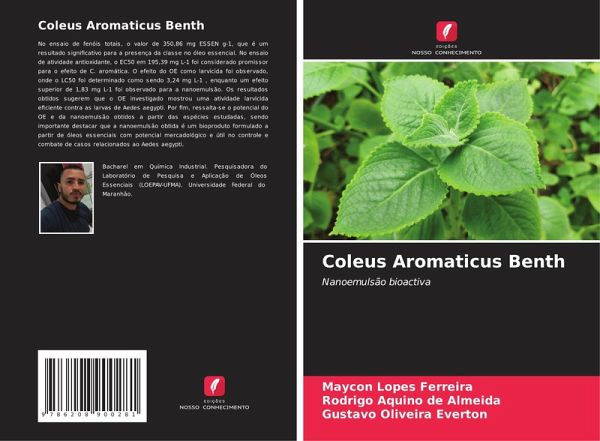 No ensaio de fenóis totais, o valor de 350,86 mg ESSEN g-1, que é um resultado significativo para a presença da classe no óleo essencial. No ensaio de atividade antioxidante, o EC50 em 195,39 mg L-1 foi considerado promissor para o efeito de C. aromática. O efeito do OE como larvicida foi observado, onde o LC50 foi determinado como sendo 3,24 mg L-1 , enquanto um efeito superior de 1,83 mg L-1 foi observado para a nanoemulsão. Os resultados obtidos sugerem que o OE investigado mostrou uma atividade larvicida eficiente contra as larvas de Aedes aegypti. Por fim, ressalta-se o potencial do OE e da nanoemulsão obtidos a partir das espécies estudadas, sendo importante destacar que a nanoemulsão obtida é um bioproduto formulado a partir de óleos essenciais com potencial mercadológico e útil no controle e combate de casos relacionados ao Aedes aegypti.