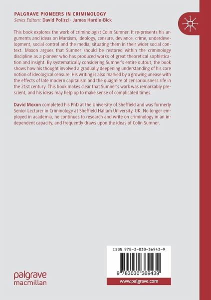 This book explores the work of criminologist Colin Sumner. It re-presents his arguments and ideas on Marxism, ideology, censure, deviance, crime, underdevelopment, social control and the media; situating them in their wider social context. Moxon argues that Sumner should be restored within the criminology discipline as a pioneer who has produced works of great theoretical sophistication and insight. By systematically considering Sumner's entire output, the book shows how his thought involved a gradually deepening understanding of his core notion of ideological censure. His writing is also marked by a growing unease with the effects of late modern capitalism and the quagmire of censoriousness rife in the 21st century. This book makes clear that Sumner's work was remarkably prescient, and his ideas may help up to make sense of complicated times.