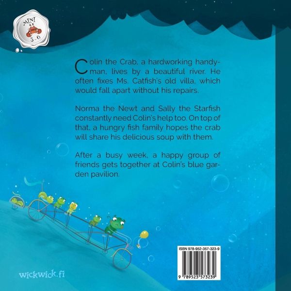 Colin the Crab, a hardworking handyman, lives by a beautiful river. He often fixes Ms. Catfish's old villa, which would fall apart without his repairs. Norma the Newt and Sally the Starfish constantly need Colin's help too. On top of that, a hungry fish family hopes the crab will share his delicious soup with them. After a busy week, a happy group of friends gets together at Colin's blue garden pavilion.