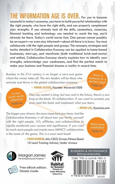 Many people have visions and dreams about running their own business or becoming financially independent. However, most are held back by lack of skills, resources and confidence. The Collaboration Economy clearly explains how to identify your strengths, acknowledge your weaknesses, and find the perfect complement to make your dreams a reality. A perfect complement may come in the form of another person's skills, talents, connections, technology or finances. The reader learns how to quickly create connections, form teams and build a business and lifestyle they desire.