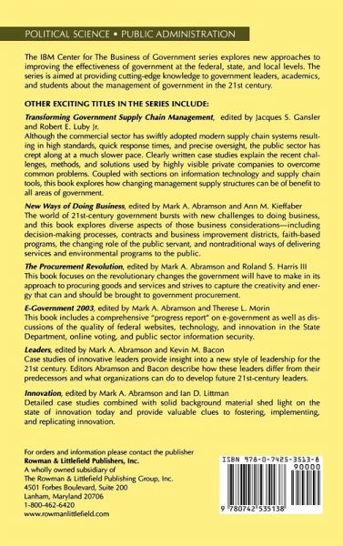 As government faces more complex problems, and citizens expect more, the way government delivers services and results is changing rapidly. The traditional model of government agencies administering hundreds of programs by themselves is giving way to one-stop services and cross-agency results. This translation implies collaboration-within agencies; among agencies; among levels of governments; and among the public, private, and nonprofit sectors. The first part of this book describes what networks and partnerships are. The second part presents case examples of how collaborative approaches have actually worked in the public sector, when they should be used, and what it takes to manage and coordinate them.