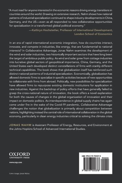 Collaborative Advantage offers a bold new take on the drivers and consequences of globalization, both for innovation in renewable energy industries and domestic politics. In an era of rapid international economic integration, how do countries interact, innovate, and compete in industries, like energy, that are fundamental to national interests? In Collaborative Advantage, Jonas Nahm examines the development of the wind and solar industries, two historically important sectors that have long been the target of ambitious public policy. As wind and solar grew from cottage industries into lucrative global sectors of geopolitical importance, China, Germany, and the United States each developed distinct constellations of firms with starkly different technical capabilities. The book shows that globalization itself has reinforced such distinct national patterns of industrial specialization. Economically, globalization has allowed domestic firms to specialize in specific activities because of new opportunities to collaborate with firms from abroad. Politically, new possibilities for specialization have allowed firms to repurpose existing domestic institutions for application in new industries. Against the backdrop of policy efforts that have generally failed to grasp the cross-national nature of innovation, the book offers a novel explanation for both the causes of changes in the global organization of innovation and their impact on domestic politics. As interdependence in global supply chains has again come under fire in the wake of the Covid-19 pandemic, Collaborative Advantage challenges the notion that globalization is primarily about competition between nations, highlighting instead the central role of international collaboration in the global economy, particularly in clean energy industries critical to solving the climate crisis.