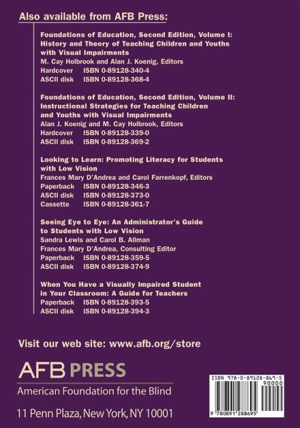 Collaborative Assessment is designed to help all professionals who work with visually impaired students understand the impact of visual impairment on assessing students' learning potential. Written by the expert assessment team at the California School for the Blind, this book focuses on evaluating students in a variety of areas, including psychology, speech and language, orientation and mobility, and technology, and provides a framework for developing a cooperative, interactive team of professionals from a variety of disciplines to achieve accurate evaluation of the needs and strengths of students. School psychologists, speech and language pathologists, administrators, teachers, and parents will find this book invaluable. Includes helpful forms and checklists and annotated lists of assessments in each area.