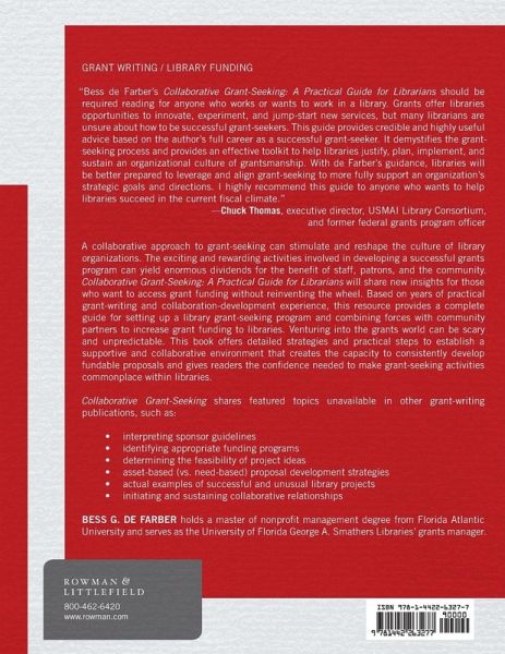 A collaborative approach to grant seeking can stimulate and reshape the culture of your library organization. The exciting and rewarding activities of developing a successful grants program can yield enormous dividends for the benefit of your staff, patrons, and community. Collaborative Grant-Seeking: A Practical Guide for Librarians will share new insights for those who want to access grant funding without reinventing the wheel. Based on years of practical grant writing and collaboration development experience, this resource provides a complete guide for setting up a library grant-seeking program, and for combining forces with community partners to increase grant funding to libraries. Venturing into the grants world can be scary and unpredictable. This book offers detailed strategies and practical steps to establish a supportive and collaborative environment that creates the capacity to consistently develop fundable proposals, and gives readers the confidence needed to make grant-seeking activities commonplace within libraries.