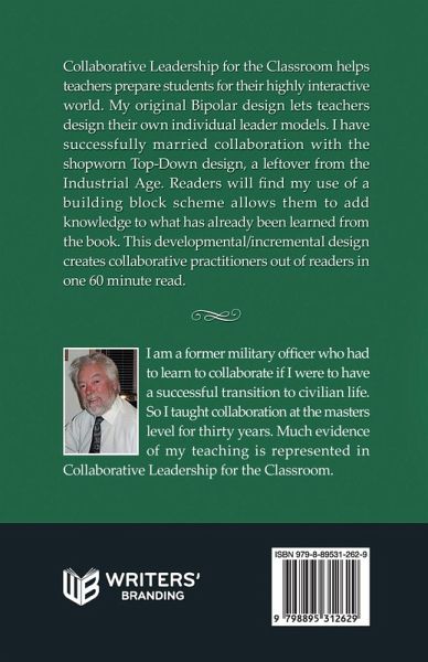 Synopsis: Collaborative Leadership for the Classroom helps teachers prepare students for their highly interactive world. My original Bipolar design lets teachers design their own individual leader models. I have successfully married collaboration with the shopworn Top-Down design, a leftover from the Industrial Age. Readers will find that my use of a building block scheme allows them to add knowledge to what has already been learned from the book. This developmental/incremental design creates collaborative practitioners out of readers in one 60-minute read. Autobiography: I am a former military officer who had to learn to collaborate if I were to have a successful transition to civilian life. So I taught collaboration at the masters level for thirty years. Much evidence of my teaching is represented in Collaborative Leadership for the Classroom.