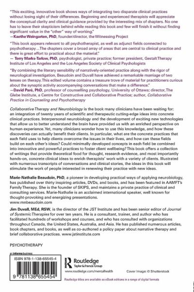 Marie-Nathalie Beaudoin, PhD, a pioneer in developing practical ways of applying neurobiology, has published over thirty inspiring articles, DVDs, books, and has been featured in AAMFT's Family Therapy. She is the founder of SKIPS, and maintains a private practice of clinical and consulting services. Marie-Nathalie is an acclaimed international speaker, well-known for thought-provoking and energizing presentations. www.mnbeaudoin.com Jim Duvall, MEd, RSW, is the director of the JST Institute and has been senior editor of Journal of Systemic Therapies for over ten years. He is a consultant, trainer and author who has facilitated hundreds of workshops and courses, and who has consulted with organizations throughout Canada, the United States, Australia, and Asia. He has published numerous articles, book chapters, and books, as well as co-authored a policy paper about narrative therapy and brief collaborative practices. www.jstinstitute.com
