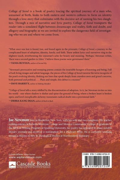 Collage of Seoul is a book of poetry tracing the spiritual journey of a man who, unnamed at birth, looks to both Eastern and Western cultures to form an identity through a love story that culminates with the decisive act of naming his two daughters. Through a mix of narrative and lyric poetry, Collage of Seoul transports the reader into a simulated flight between dreamscape and reality, faith and doubt, and allegory and biography as we are invited to explore the dangerous field of investigating who we are and where we come from.