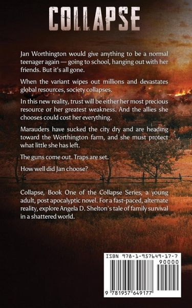 Jan Worthington's life was once one of normalcy and routine, until the variant swept across the globe, leaving destruction in its wake. As society crumbles around her, Jan's trust becomes either her greatest strength or her gravest weakness. With the looming threat of marauders on her doorstep, Jan must choose her allies carefully in order to protect what little she has left. The Collapse Series, an action-packed young adult saga, follows Jan on her journey through a post-apocalyptic world as she fights to keep her family safe amidst chaos and devastation. Join Angela D. Shelton in this gripping alternate reality and discover the unparalleled power of familial bonds in the face of destruction.