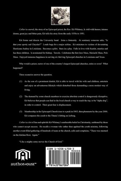 Collar is a novel, the story of an Episcopal priest, the Rev. Kit Whitney, Jr. told with humor, intense drama, great joy and bitter pain, Kit tells his story from the early 1930s to 1981. Kit forms and directs the University band. Joins a fraternity. At seminary someone asks, "Is that your sporty red Chrysler?" Loads bags for a major airline. Kit ministers to victims of devastating Hurricane Audrey in Louisiana. Becomes a pilot. Stars in a play. Falls in love with Scarlet, marries and has three children. Is nominated for bishop. Travels. Celebrates the first Jazz Mass, Mariachi Mass, Polo Bass. Enjoyed immense happiness in serving six thriving Episcopal churches in Louisiana and Texas. Why would a priest, rector of one of the country's largest Episcopal churches, retire so soon? What happened? Three scenarios answer the question. (1) As the son of a prominent dentist, Kit is able to travel with his wife and children, entertain and enjoy an adventurous lifestyle which disturbed those demanding a more modest way of living. (2) The demand by some church members to exercise absolute control is dangerously disruptive. Kit believes that people can find in the local church a way to reach the top, to be "alpha dog", in order to control. Their great fear is displacement. (3) Membership in the Episcopal Church rises to a peak in 1965, then plummets by the year 2000. Kit compares the crash to the Titanic's hitting an iceberg. Collar is a lot of fun and upholds Kit Whitney's unalterable belief in Christianity, saddened by those who cannot accept success. He recalls a woman who rather than applaud the youth ministry, following another event-filled gathering of hundreds of teens at the church, calls and complains, "There was mustard on the kitchen floor. Again." "Like a mighty army moves the Church of God."