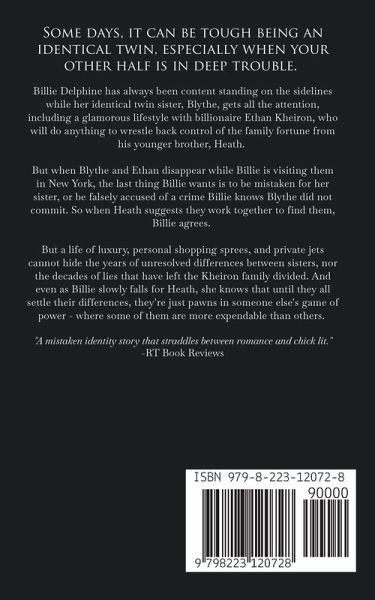 Some days, it can be tough being an identical twin, especially when your other half is in deep trouble. Billie Delphine has always been content standing on the sidelines while her identical twin sister, Blythe, gets all the attention, including a glamorous lifestyle with billionaire Ethan Kheiron, who will do anything to wrestle back control of the family fortune from his younger brother, Heath. But when Blythe and Ethan disappear while Billie is visiting them in New York, the last thing Billie wants is to be mistaken for her sister, or be falsely accused of a crime Billie knows Blythe did not commit. So when Heath suggests they work together to find them, Billie agrees. But a life of luxury, personal shopping sprees, and private jets cannot hide the years of unresolved differences between sisters, nor the decades of lies that have left the Kheiron family divided. And even as Billie slowly falls for Heath, she knows that until they all settle their differences, they're just pawns in someone else's game of power - where some of them are more expendable than others. A MISTAKEN IDENTITY STORY THAT STRADDLES BETWEEN ROMANCE AND CHICKLIT." - RT BOOK REVIEWS