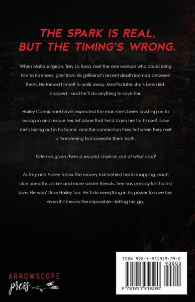 The spark is real, but the timing's wrong. When Mafia surgeon, Trey La Rosa, met the one woman who could bring him to his knees, grief from his girlfriend's recent death loomed between them. He forced himself to walk away. Months later, she's been kidnapped-and he'll do anything to save her. Hailey Carmichael never expected the man she's been crushing on to swoop in and rescue her, let alone that he'd claim her for himself. Now she's hiding out in his home, and the connection they felt when they met is threatening to incinerate them both. Fate has given them a second chance, but at what cost? As Trey and Hailey follow the money trail behind her kidnapping, each clue unearths darker and more sinister threats. Trey has already lost his first love. He won't lose Hailey too. He'll do everything in his power to save her, even if it means the impossible-letting her go.