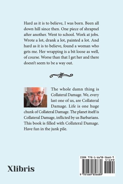 Hard as it is to believe, I was born. Been all down hill since then. One piece of shrapnel after another. Went to school. Work at jobs. Wrote a lot, drank a lot, painted a lot. And hard as it is to believe, found a woman who gets me. Her wrapping is a bit loose as well, of course. Worse than that I get her and there doesn't seem to be a way out.