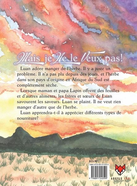 Luan adore manger de l'herbe. Il y a juste un problème. Il n'a pas plu depuis des jours, et l'herbe dans son pays d'origine en Afrique du Sud est complètement sèche. Lorsque maman et papa Lapin offrent des feuilles et d'autres aliments, les frères et surs de Luan savourent les saveurs. Luan se plaint. Il ne veut rien manger d'autre que de l'herbe. Luan apprendra-t-il à apprécier différents types de nourriture?