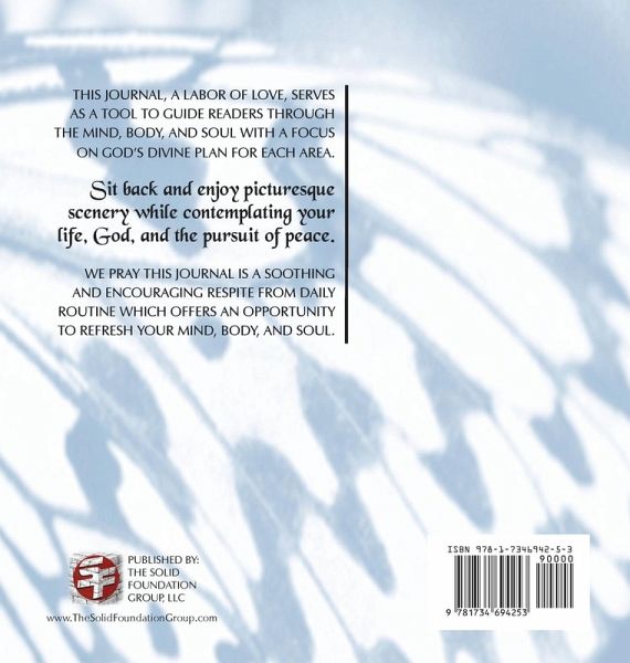 This journal, a labor of love, serves as a tool to guide readers through the mind, body, and soul with a focus on God's divine plan for each area. Sit back and enjoy picturesque scenery while contemplating your life, God, and the pursuit of peace. We pray this journal is a soothing and encouraging respite from daily routine which offers an opportunity to refresh your mind, body, and soul.