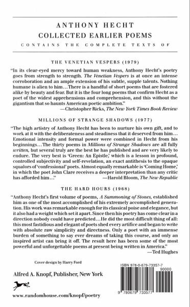 THE VENETIAN VESPERS (1979) "In its clear-eyed mercy toward human weakness, Anthony Hecht's poetry goes from strength to strength. The Venetian Vespers is at once an intense corroboration and an ample extension of his subtle, supple talents. Nothing humane is alien to him… There is a handful of short poems that are fostered alike by beauty and fear. But it is the four long poems that confirm Hecht as a poet of the widest apprehensions and comprehension, and this without the gigantism that so haunts American poetic ambition." -Christopher Ricks, The New York Times Book Review MILLIONS OF STRANGE SHADOWS (1977) "The high artistry of Anthony Hecht has been to nurture his own gift, and to work at it with the deliberateness and steadiness that it deserved from him... Emotional intensity and formal power were combined in Hecht from his beginnings… The thirty poems in Millions of Strange Shadows are all fully written, but several truly are the best he has published and are very likely to endure. The very best is 'Green: An Epistle,' which is a lesson in profound, controlled subjectivity and self-revelation, an exact antithesis to the opaque squalors of 'confessional' poets. Almost equally remarkable is 'Coming Home,' in which the poet John Clare receives a deeper interpretation than any critic has afforded him…" -Harold Bloom, The New Republic THE HARD HOURS (1968) "Anthony Hecht's first volume of poems, A Summoning of Stones, established him as one of the most accomplished of his extremely accomplished generation. His work was remarkable enough for its classical poise and elegance, but it also had a weight which set it apart. Since then his poetry has come clear in a direction nobody could have predicted…He did the most difficult thing of all: this most fastidious and elegant of poets shed every artifice and began to write with absolute raw simplicity and directness. Only a poet with an immense burden of something to say ever dreams of taking this course, and only an inspired artist can bring it off. The result here has been some of the most powerful and unforgettable poems at present being written in America," -Ted Hughes
