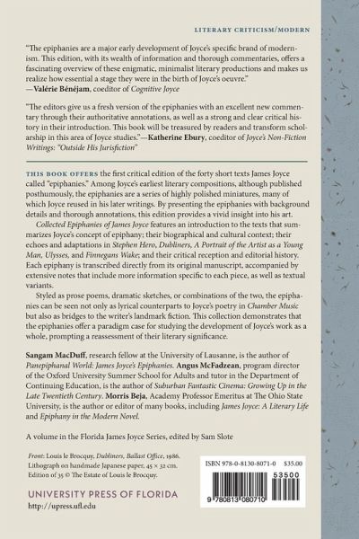 Sangam MacDuff, research fellow at the University of Lausanne, is the author of Panepiphanal World: James Joyce's Epiphanies. Angus McFadzean, program director of the Oxford University Summer School for Adults and tutor in the Department of Continuing Education, is the author of Suburban Fantastic Cinema: Growing Up in the Late Twentieth Century. Morris Beja, Academy Professor Emeritus at The Ohio State University, is the author or editor of many books, including James Joyce: A Literary Life and Epiphany in the Modern Novel.