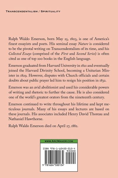 Ralph Waldo Emerson, born May 25, 1803, is one of Americäs finest essayists and poets. His seminal essay Nature is considered to be the pivotal writing on Transcendentalism of its time, and his Collected Essays (comprised of the First and Second Series) is often cited as one of top 100 books in the English language. The First Series is a companion piece to the Second Series, also available from Arc Manor.