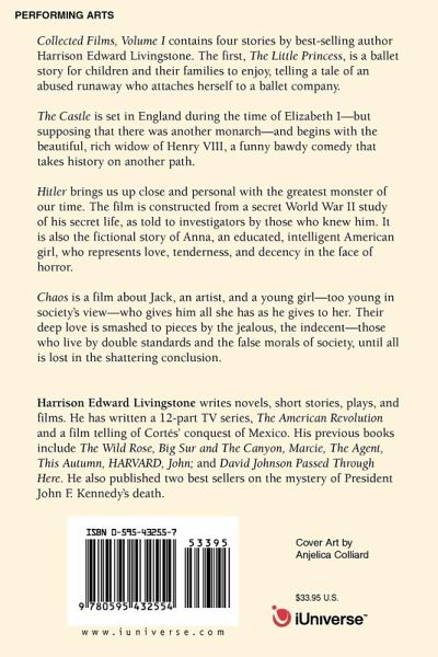 Collected Films, Volume I contains four stories by best-selling author Harrison Edward Livingstone. The first, The Little Princess, is a ballet story for children and their families to enjoy, telling a tale of an abused runaway who attaches herself to a ballet company. The Castle is set in England during the time of Elizabeth I-but supposing that there was another monarch-and begins with the beautiful, rich widow of Henry VIII, a funny bawdy comedy that takes history on another path. Hitler brings us up close and personal with the greatest monster of our time. The film is constructed from a secret World War II study of his secret life, as told to investigators by those who knew him. It is also the fictional story of Anna, an educated, intelligent American girl, who represents love, tenderness, and decency in the face of horror. Chaos is a film about Jack, an artist, and a young girl-too young in society's view-who gives him all she has as he gives to her. Their deep love is smashed to pieces by the jealous, the indecent-those who live by double standards and the false morals of society, until all is lost in the shattering conclusion.
