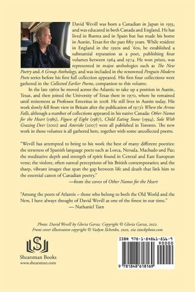 David Wevill was born a Canadian in Japan in 1935, and was educated in both Canada and England. He has lived in Burma and in Spain but has made his home in Austin, Texas for the past fifty years. While resident in England in the 1950s and '60s, he established a substantial reputation as a poet, publishing four volumes between 1964 and 1974. He won prizes, was represented in major anthologies such as The New Poetry and A Group Anthology, and was included in the renowned Penguin Modern Poets series before his first full collection appeared. His first four collections were gathered in the Collected Earlier Poems, companion to this volume. In the late '60s he moved across the Atlantic to take up a position in Austin, Texas, and then joined the University of Texas there in 1970, where he remained until retirement as Professor Emeritus in 2008. He still lives in Austin today.