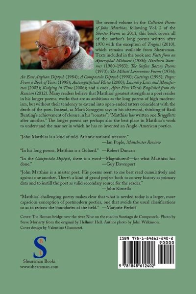 The second volume in the Collected Poems of John Matthias, following Vol. 2 of the Shorter Poems in 2011, this volume covers all of the author's long poems from before 2010. That year's Trigons is excluded and remains available from Shearsman. Texts included in the book are: Facts from an Apocryphal Midwest (1986); Northern Summer (1980-1983); The Stefan Batory Poems (1973); The Mihail Lermontov Poems (1976); An East Anglian Diptych (1990); Cuttings (1995); Pages: From a Book of Years (1998); Automystifstical Plaice (2000); Laundry Lists and Manifestoes (2003) and Kedging in Time (2006).