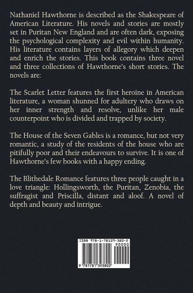 Nathaniel Hawthorne is described as the Shakespeare of American Literature. His novels and stories are mostly set in Puritan New England and are often dark, exposing the psychological complexity and evil within humanity. His literature contains layers of allegory which deepen and enrich the stories. This book contains three novel and three collections of Hawthorne's short stories. The novels are: The Scarlet Letter features the first heroine in American literature, a woman shunned for adultery who draws on her inner strength and resolve, unlike her male counterpoint who is divided and trapped by society. The House of the Seven Gables is a romance, but not very romantic, a study of the residents of the house who are pitifully poor and their endeavours to survive. It is one of Hawthorne's few books with a happy ending. The Blithedale Romance features three people caught in a love triangle: Hollingsworth, the Puritan, Zenobia, the suffragist and Priscilla, distant and aloof. A novel of depth and beauty and intrigue.