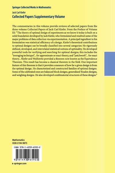 The commentaries in this volume provide reviews of selected papers from the three-volume Collected Papers of Jack Carl Kiefer. From the Preface of Volume III: "The theory of optimal design of experiments as we know it today is built on a solid foundation developed by Jack Kiefer, who formulated and resolved some of the major problems of data collection via experimentation. A principal ingredient in his formulation was statistical efficiency of a design. Kiefer's theoretical contributions to optimal designs can be broadly classified into several categories: He rigorously defined, developed, and interrelated statistical notions of optimality. He developed powerful tools for verifying and searching for optimal designs; this includes the "averaging technique"... for approximate or exact theory, and "patchwork"... for exact theory... Kiefer and Wolfowitz provided a theorem now known as the Equivalence Theorem. This result has become a classical theorem in the field. One importantfeature of this theorem is that it provides a measure of how far a given design is from the optimal design. He characterized and constructed families of optimal designs. Some of the celebrated ones are balanced block designs, generalized Youden designs, and weighing designs. He also developed combinatorial structures of these designs."